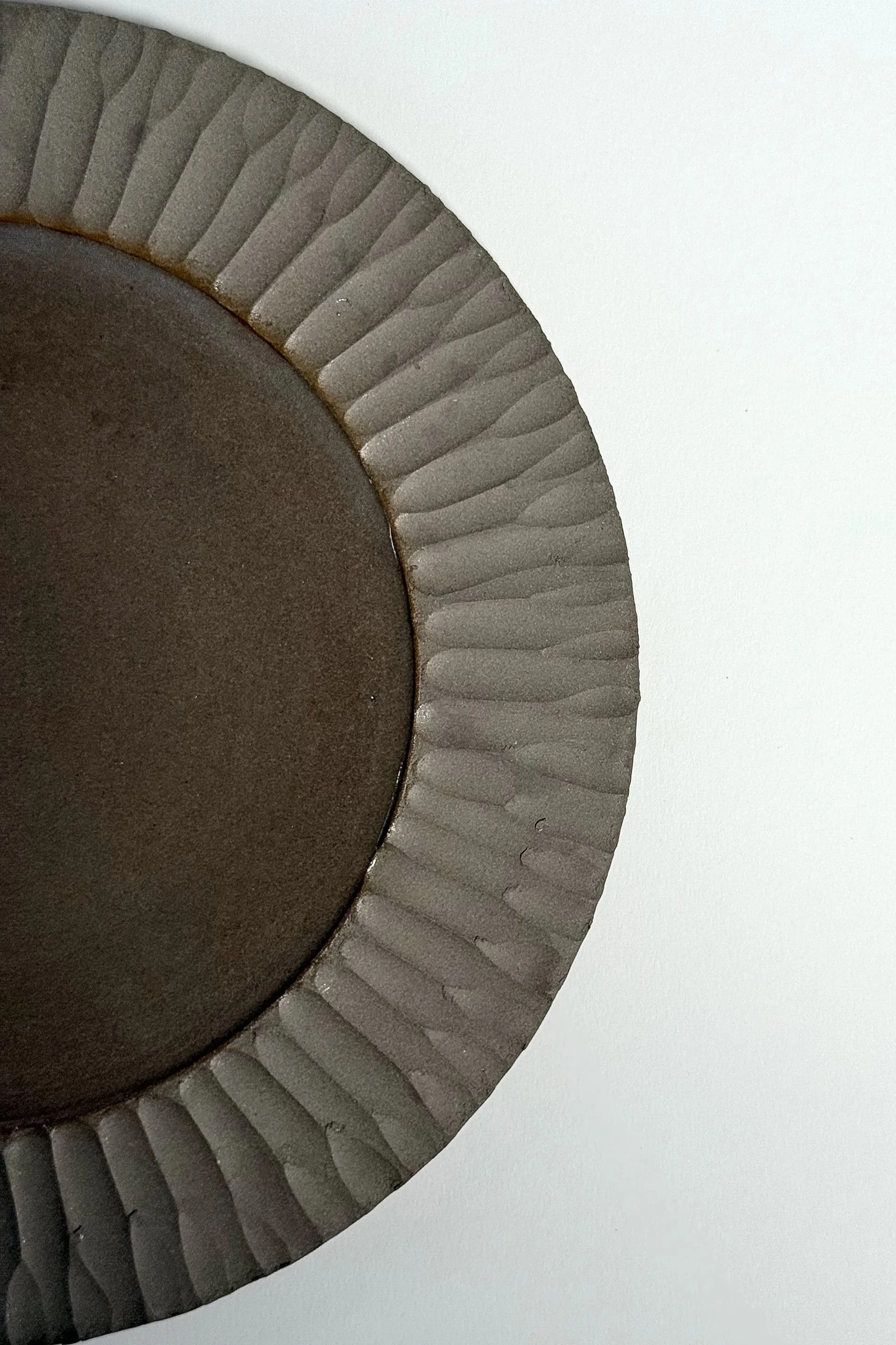 Diese Schale bewegt sich zwischen Teller und Gefäß – klar in der Form, reduziert im Ausdruck. Der breite, sanft ansteigende Rand umrahmt eine vertiefte Mitte, die Speisen Raum gibt. Die feine Körnung des Steinzeugs verleiht Tiefe, die transparente Glasur im Inneren setzt einen ruhigen Kontrast.